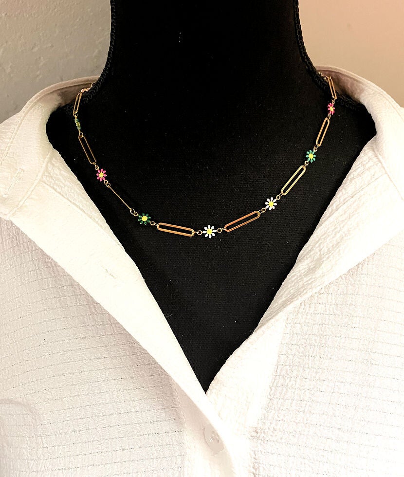 Experience the perfect combination of elegance and comfort with the Daisy link necklace from BiBz Designs. Handmade from high-quality stainless steel and decorated with colorful links and Daisy flowers, this necklace is not only fashionable, but also lightweight and comfortable to wear.