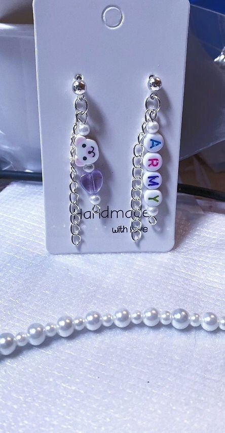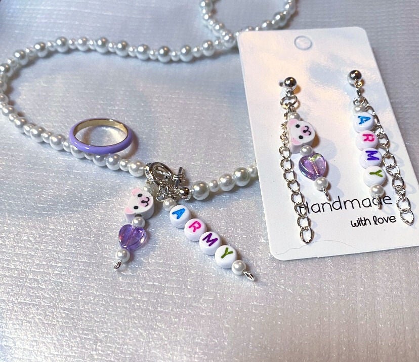 Voeg een vleugje K-Pop toe aan je accessoires met onze prachtige glasparelketting, compleet met bedels, bijpassende oorbellen en een ring. De paarse tint symboliseert liefde en vriendschap, perfect gevangen in de boodschap "I purple you!" Laat je inspireren door BTS en straal met deze unieke set, die ideaal is voor elke fan die zijn of haar passie wil uitdragen.
