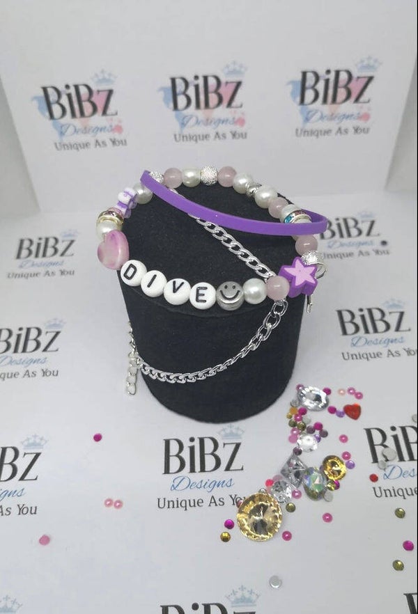 De "Dive" Ive armband is een met de hand gemaakte armband die geïnspireerd is op Kpop. De armband is gemaakt van elastisch materiaal en aluminium, waardoor hij comfortabel om de pols past en duurzaam is. Bovendien is de armband aanpasbaar, zodat hij perfect past bij elke polsmaat en stijl.