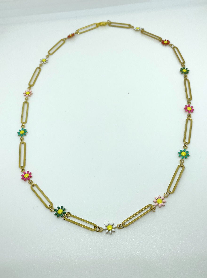 Experience the perfect combination of elegance and comfort with the Daisy link necklace from BiBz Designs. Handmade from high-quality stainless steel and decorated with colorful links and daisy flowers, this necklace is not only fashionable but also lightweight and comfortable to wear.