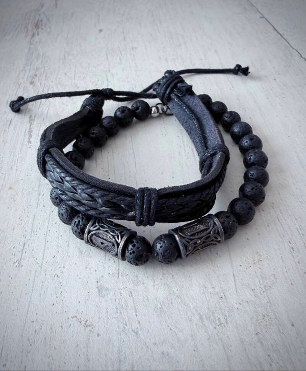 Robust Men's Bracelet Set – Black Leather & Matte Black Frosted (2-piece)