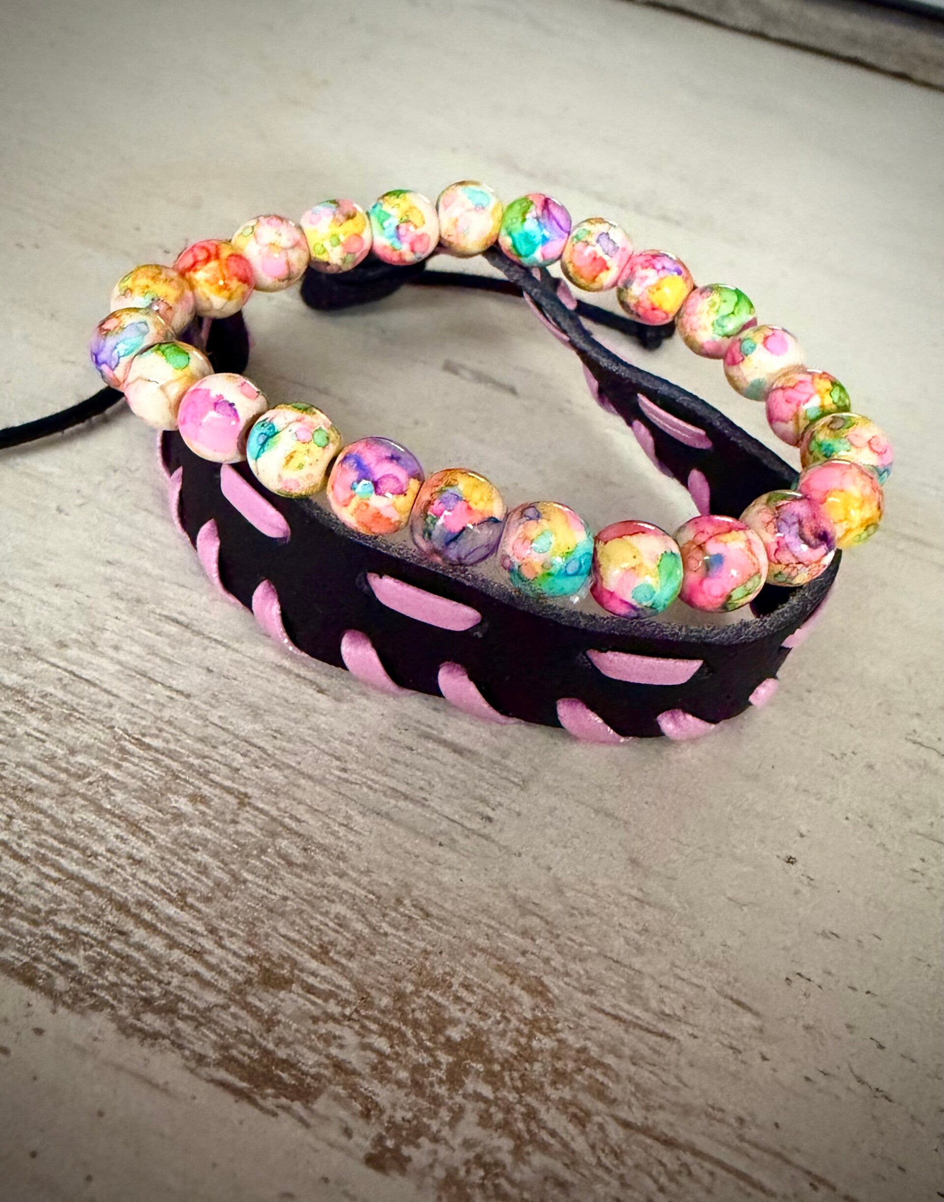 De Pink Serenity Set straalt rust, zachtheid en vrolijke energie uit. Deze set van twee armbanden combineert verstelbaar leder zwart met roze. De elastische kralenarmband heeft een speelse mix van kleuren zoals roze, wit, groen, geel, paars en oranje.
